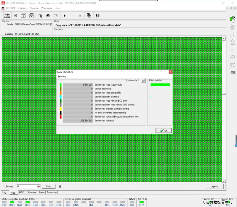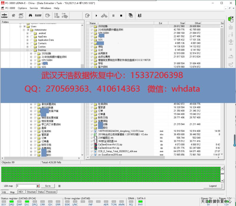 解决方案:收到硬盘后,我们使用专业的SSD恢复工具ACE PC3000 SSD,处理固件问题,虚拟重建编译器,再用PC3000 DE虚拟镜像,成功恢复客户硬盘内大部分数据,包含客户的管家婆数据库。