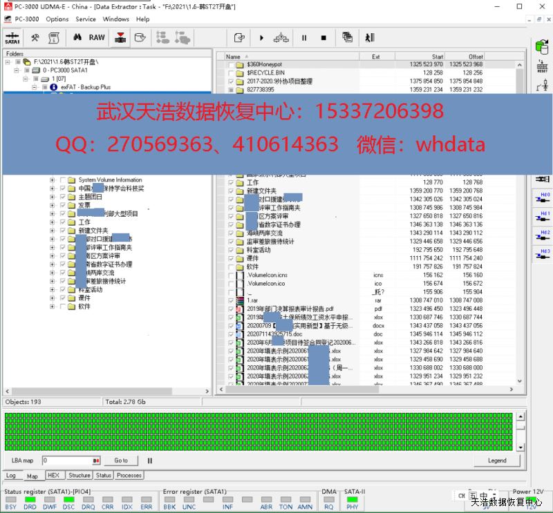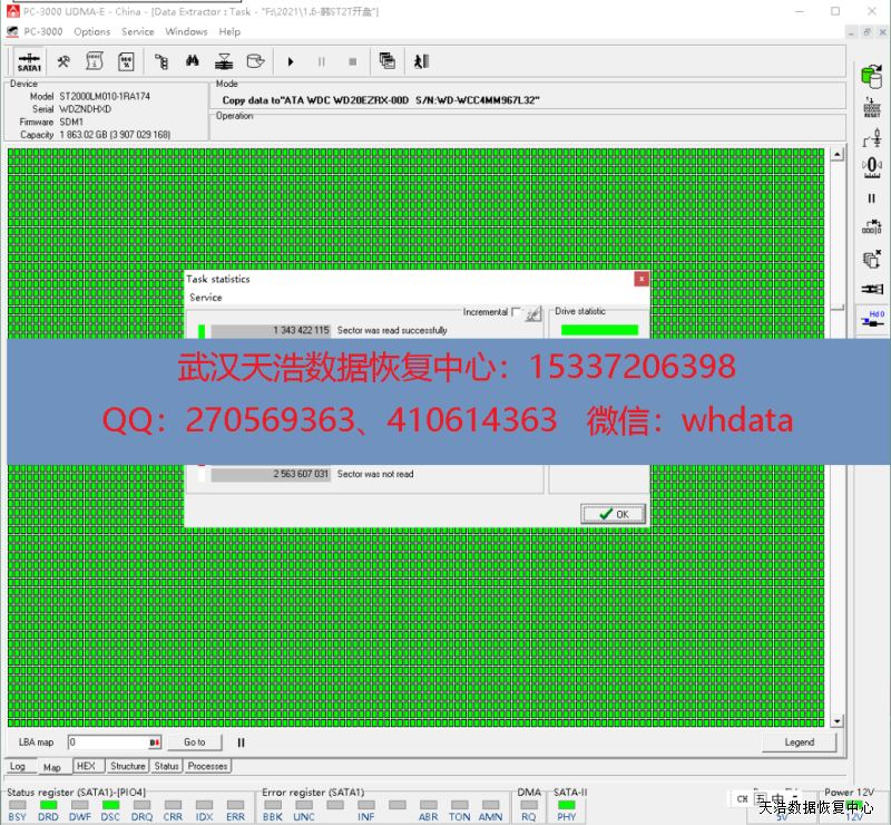 解决方案:收到硬盘后,我们在无尘环境打开盘腔清洗盘片,然后更换兼容的磁头,再接到数据恢复工具PC-3000 UDMA Express上,通电,硬盘正常认盘,镜像,成功恢复客户硬盘几乎全部数据!