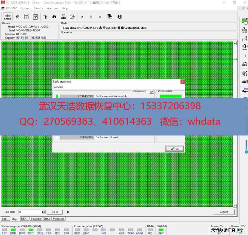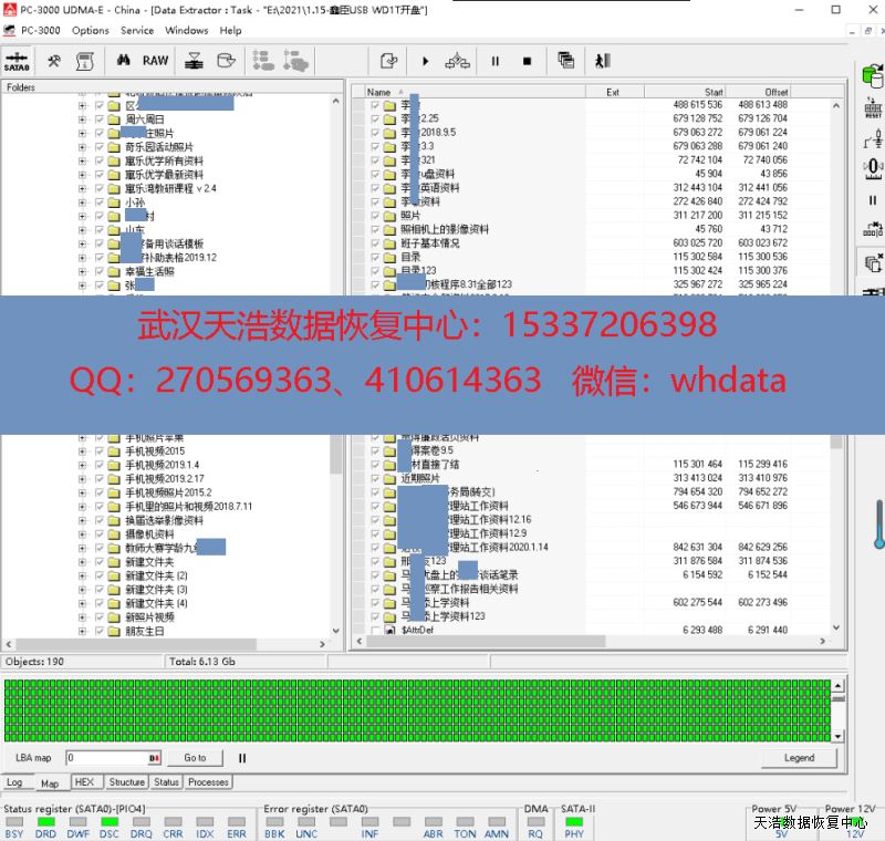 解决方案:收到硬盘后,接到专业数据恢复工具PC3000 UDMA EXPRESS上,我们使用热交换技术,备份出原始固件,经分析是原始40模块被替换导致这种现象,通过技术手段恢复原始40后,发现不能正常写入,只好再通过热交换技术通刷一套固件,再写入故障盘的关键模块后,热交换DE镜像,最后成功恢复客户硬盘内5百G的照片、视频及其它数据!