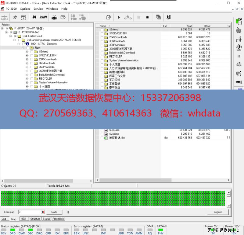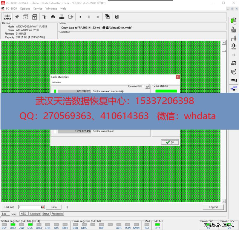 解决方案:收到硬盘后,我们在无尘环境更换兼容磁头,更换兼容的SATA电路板,接到专业数据恢复工具PC3000 UDMA EXPRESS上,通电硬盘正常认盘,DE镜像,成功恢复客户硬盘内几乎全部数据!