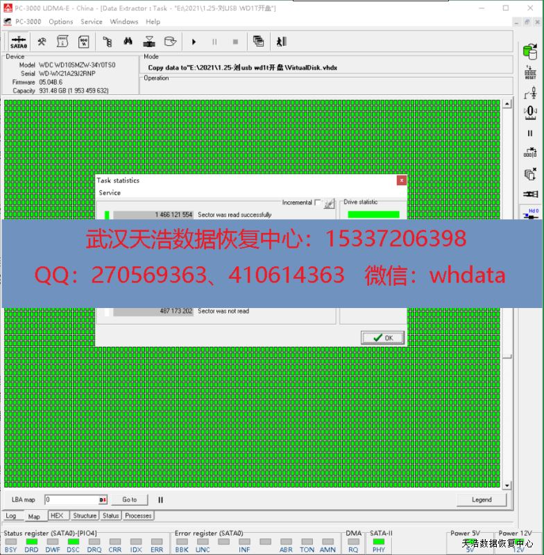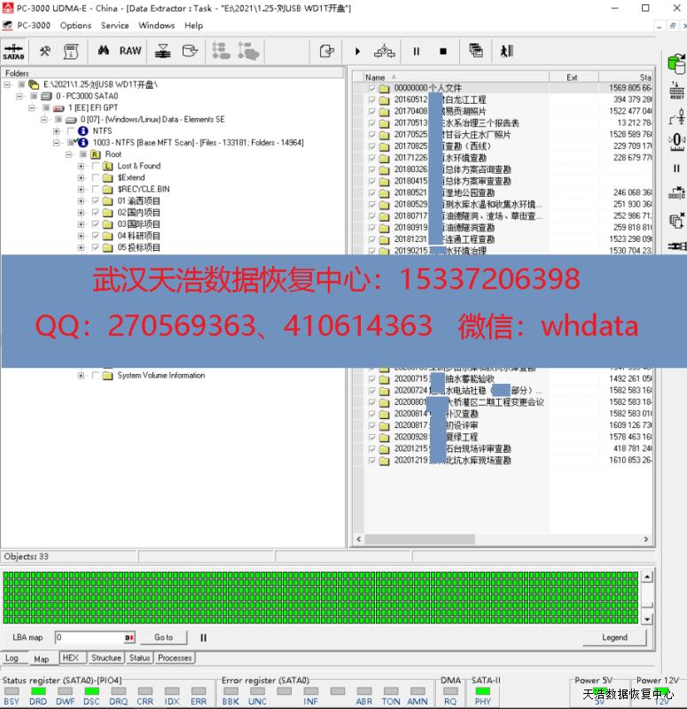 解决方案:收到硬盘后,我们在无尘环境更换兼容磁头,更换兼容的SATA解锁电路板,再接到专业数据恢复工具PC3000 UDMA EXPRESS上,通电硬盘正常认盘,DE镜像,成功恢复客户硬盘内几乎全部数据!