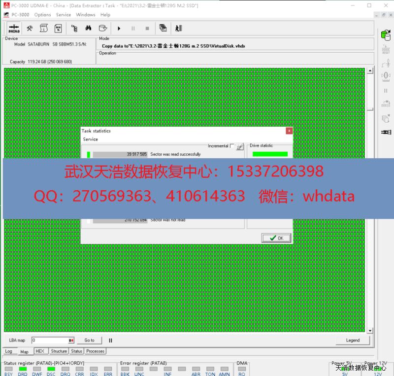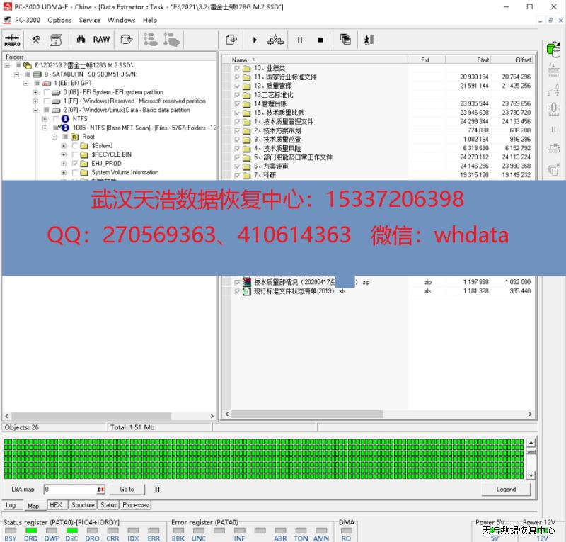 解决方案:收到硬盘后,我们接到专业的SSD恢复工具ACE PC3000 SSD上,短接通电,处理固件问题,虚拟重建编译器,用PC3000 DE虚拟镜像,成功恢复里面客户公司的几乎全部工作资料!