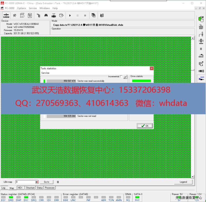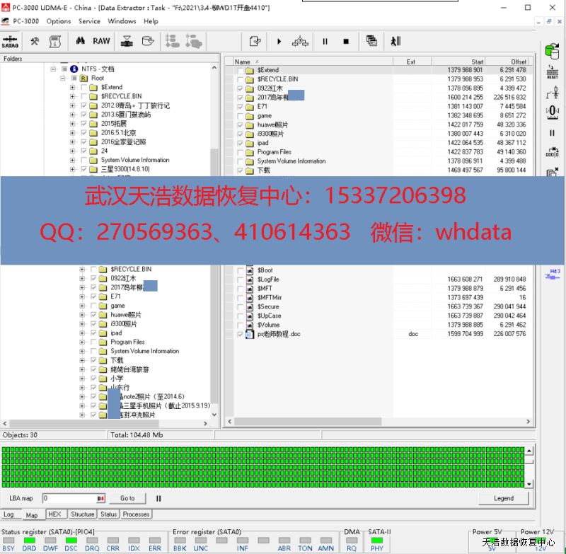 解决方案:收到硬盘后,接到专业数据恢复工具PC3000 UDMA Express上,检测发现有一个磁头不良,在无尘环境更换兼容的磁头,再通电硬盘正常认盘,DE镜像,成功恢复客户硬盘内几乎全部数据!