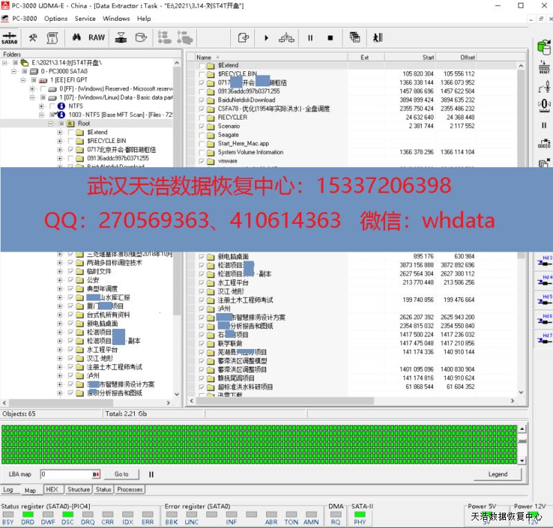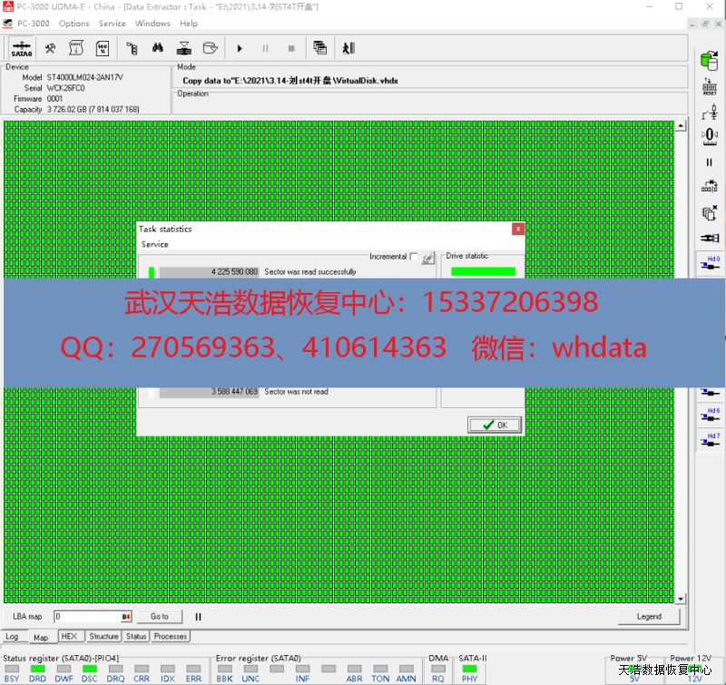 解决方案:收到硬盘后,我们在无尘环境更换兼容的磁头,再接到数据恢复工具PC-3000 UDMA Express上,通电,硬盘正常认盘,镜像,成功恢复硬盘内2T多的数据!