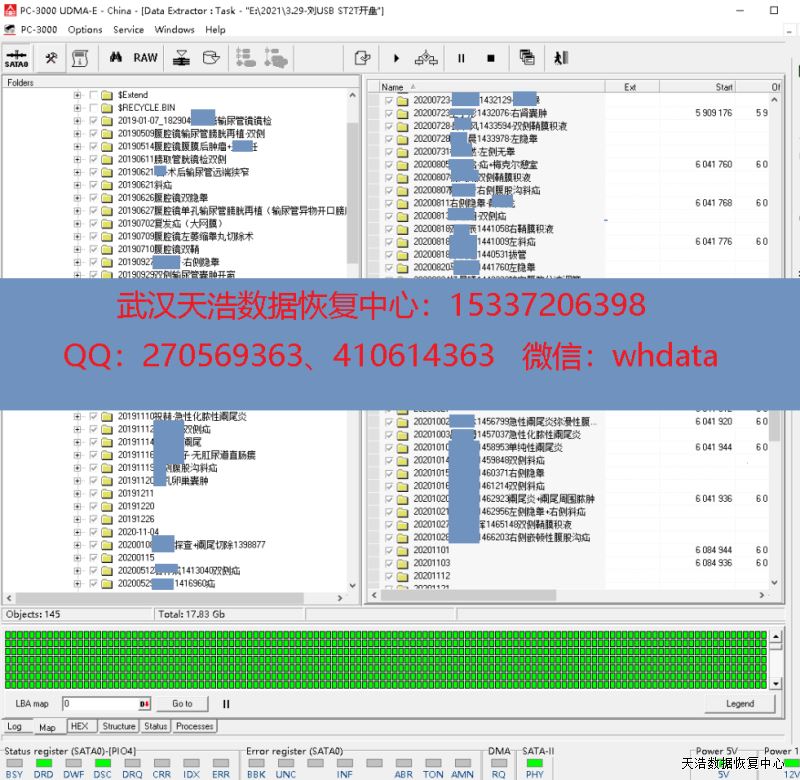 解决方案:收到硬盘后,我们在无尘环境打开盘腔清洗盘片,然后更换兼容的磁头,再接到数据恢复工具PC-3000 UDMA Express上,通电,硬盘正常认盘,镜像,成功恢复客户硬盘几乎全部数据!
