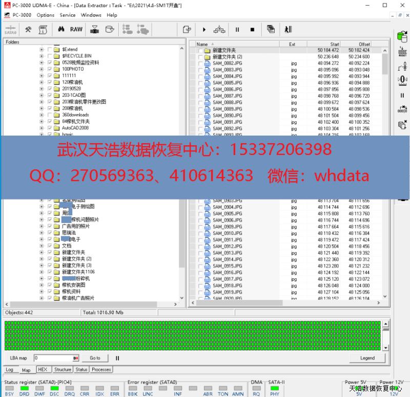 解决方案:收到硬盘后,我们在无尘环境更换兼容的磁头,再接到专业数据恢复工具PC-3000 UDMA Express上,通电硬盘正常认盘,DE分头镜像,成功恢复硬盘内几乎全部数据!