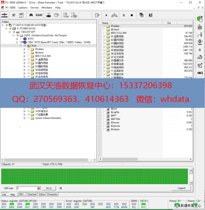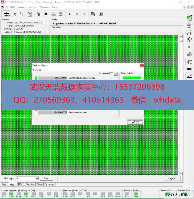 解决方案:收到硬盘后,我们在无尘环境更换兼容的磁头,再更换兼容的SATA无锁电路板,接到专业数据恢复工具PC3000 UDMA EXPRESS上,通电硬盘不认盘,检测固件修复固件问题,断电通电硬盘正常认盘,DE分头,再原usb板改SATA镜像,成功恢复客户硬盘内几乎全部数据!