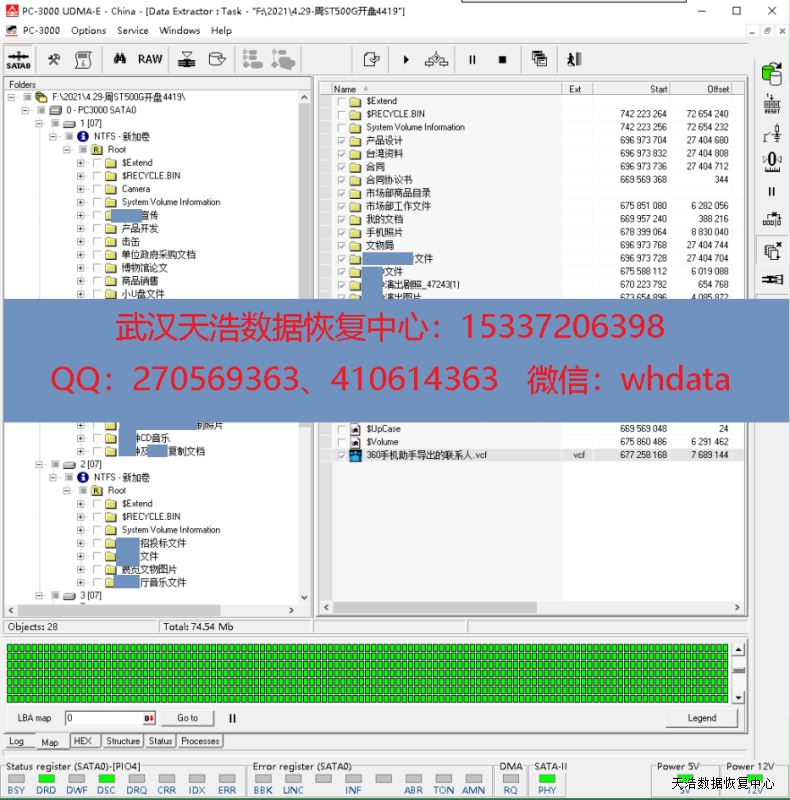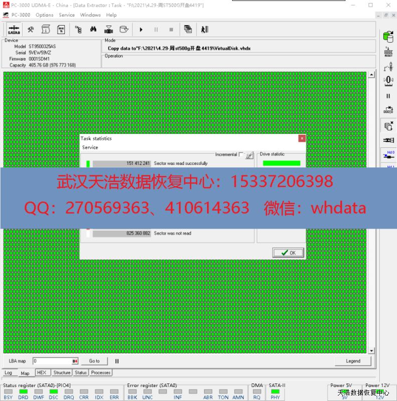 解决方案:收到硬盘后,在无尘环境拆开,更换兼容的磁头,再接到专业的数据恢复工具PC3000 UDMA EXPRESS上,通电硬盘正常认盘,建立DE任务分头镜像,成功恢复硬盘内绝大部分数据!