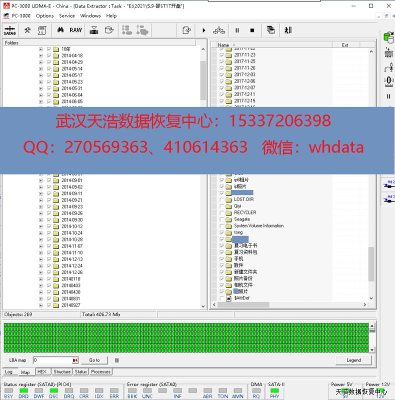 解决方案:收到硬盘后,我们在无尘环境更换兼容的磁头,再接到专业数据恢复工具PC-3000 UDMA Express上,通电硬盘正常认盘,DE分头镜像,成功恢复硬盘内几乎全部数据!