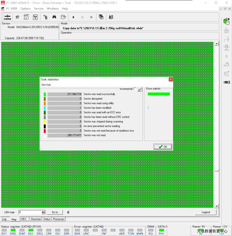 解决方案:收到硬盘后,我们接到专业的SSD恢复工具ACE PC3000 SSD上,短接通电,处理固件问题,虚拟重建编译器,用PC3000 DE虚拟镜像,成功恢复硬盘内几乎全部数据!