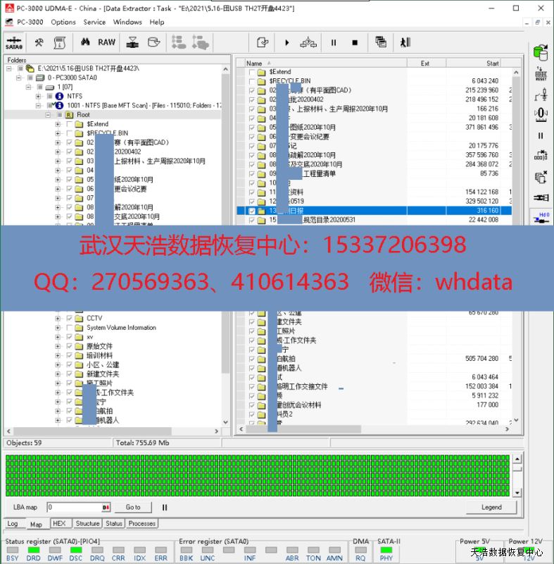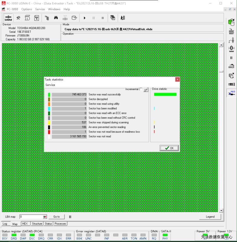 解决方案:收到硬盘后,我们更换兼容的SATA电路板后,接到数据恢复工具PC3000 UDMA EXPRESS上,处理固件问题,DE分头镜像,发现是有一个磁头不良,于是在无尘环境更换兼容的磁头,再DE镜像,成功恢复客户硬盘里面的几乎全部数据。