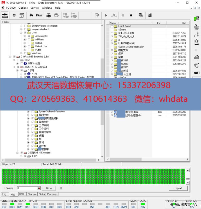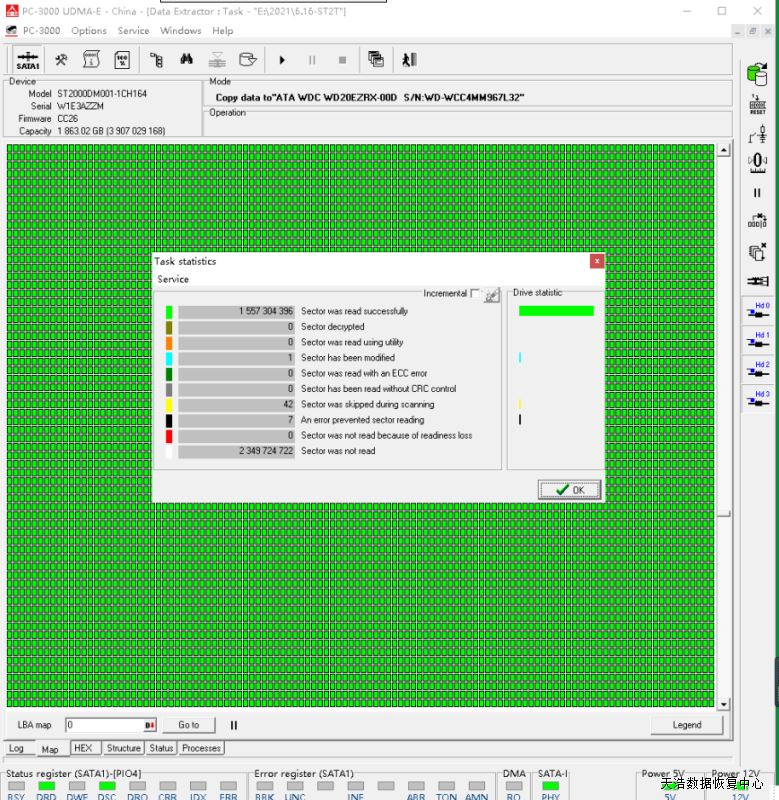 解决方案:收到硬盘后,接到数据恢复工具PC-3000 UDMA Express上通电不认盘,修复固件问题后,硬盘通电正常认盘,DE分头镜像,发现有一个磁头不良,在无尘环境开盘更换兼容的磁头后,成功恢复客户硬盘内几乎全部数据。