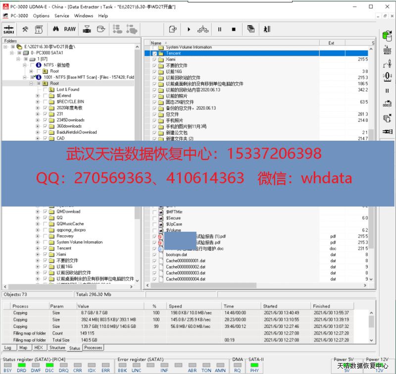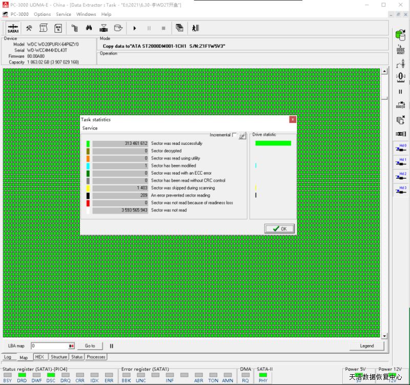 解决方案:收到硬盘后,我们在无尘环境更换兼容的磁头,再接到专业数据恢复工具PC3000 UDMA Express上,通电硬盘正常认盘,DE镜像,成功恢复硬盘内客户公司绝大部分数据!