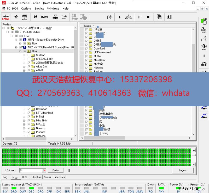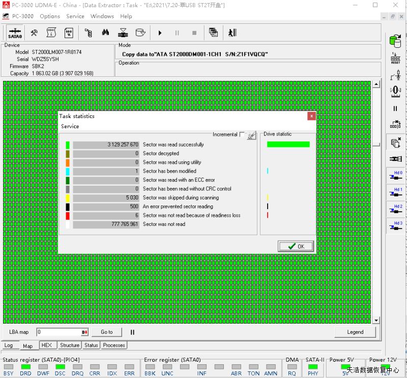 解决方案:收到硬盘后,我们在无尘环境打开盘体,清洗盘片,然后更换兼容的磁头,再接到数据恢复工具PC-3000 UDMA Express上,通电,硬盘正常认盘,镜像,成功恢复客户硬盘几乎全部数据!