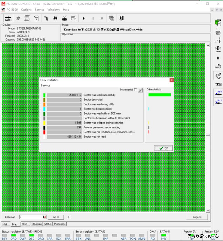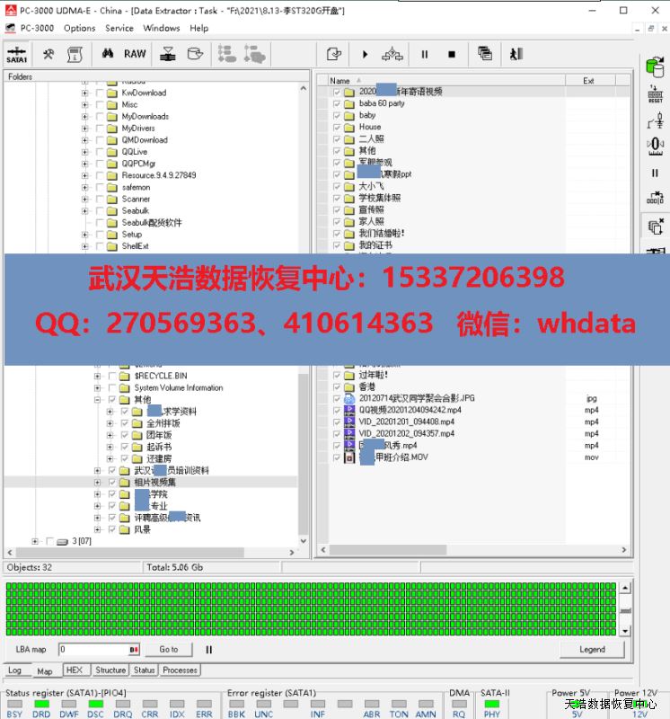 解决方案:收到硬盘后,我们在无尘环境打开盘体,更换兼容的磁头,再接到数据恢复工具PC-3000 UDMA Express上,通电,硬盘正常认盘,镜像,成功恢复客户硬盘内绝大部分数据!