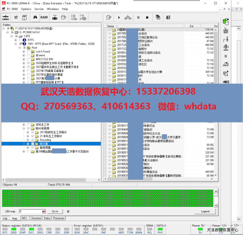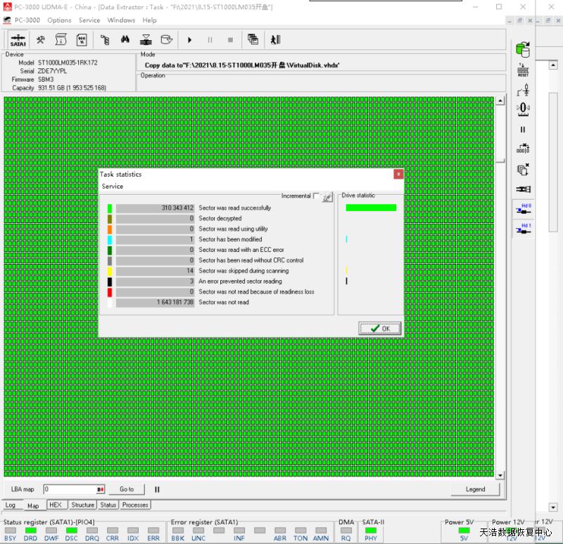 解决方案:收到硬盘后,我们在无尘环境打开盘体,更换兼容的磁头,再接到数据恢复工具PC-3000 UDMA Express上,通电,硬盘正常认盘,镜像,成功恢复客户硬盘几乎全部数据!