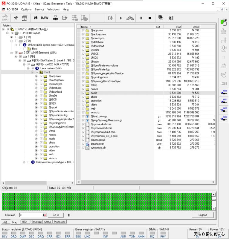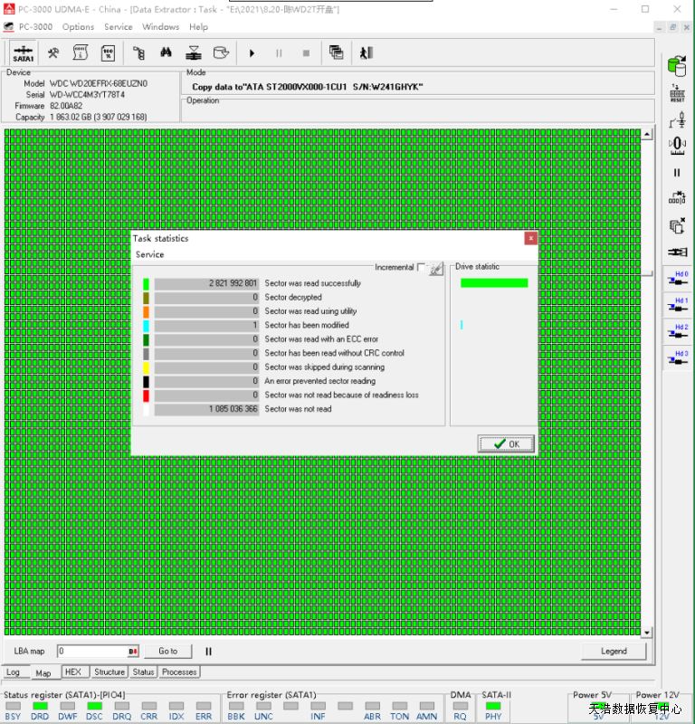 解决方案:收到硬盘后,我们在无尘环境更换兼容的磁头,再接到专业数据恢复工具PC3000 UDMA Express上,通电硬盘正常认盘,DE镜像,成功恢复硬盘内几乎全部数据!