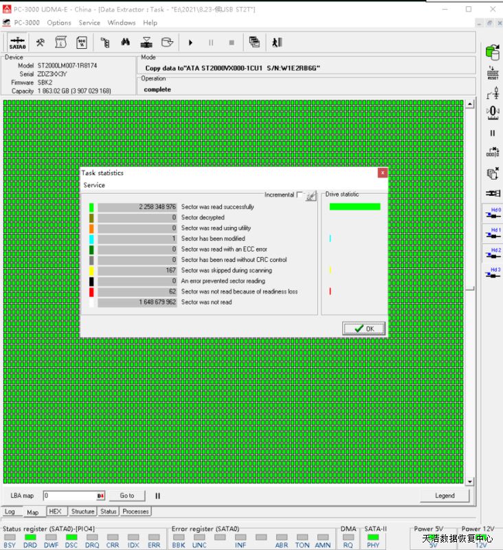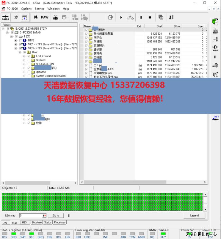 解决方案:收到硬盘后,我们在无尘环境打开盘体,清洗盘片,然后更换兼容的磁头,再接到数据恢复工具PC-3000 UDMA Express上,通电,硬盘正常认盘,镜像,成功恢复客户硬盘几乎全部数据!