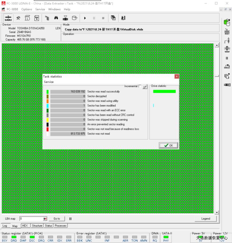 注:东芝的台盘,只要是突然不能读盘的,就算正常认盘,不敲盘,大多也是磁头问题,更换全好磁头后,恢复效果都非常好!