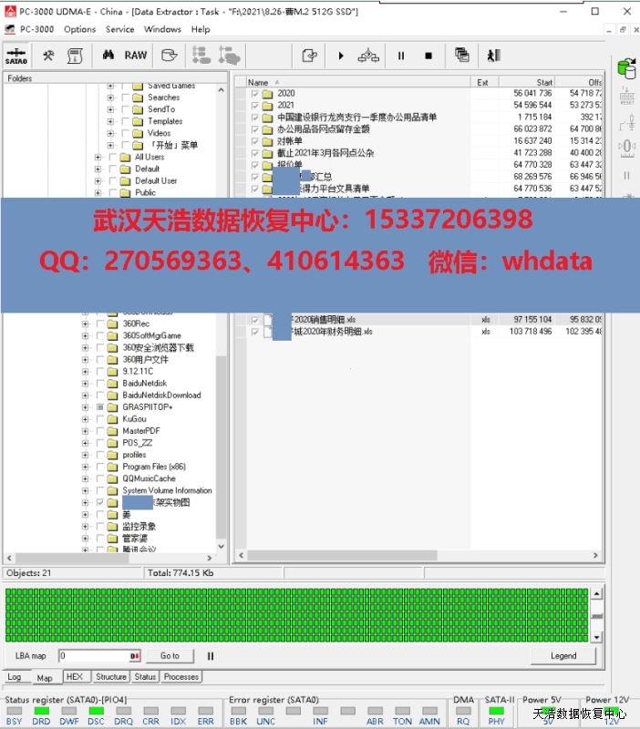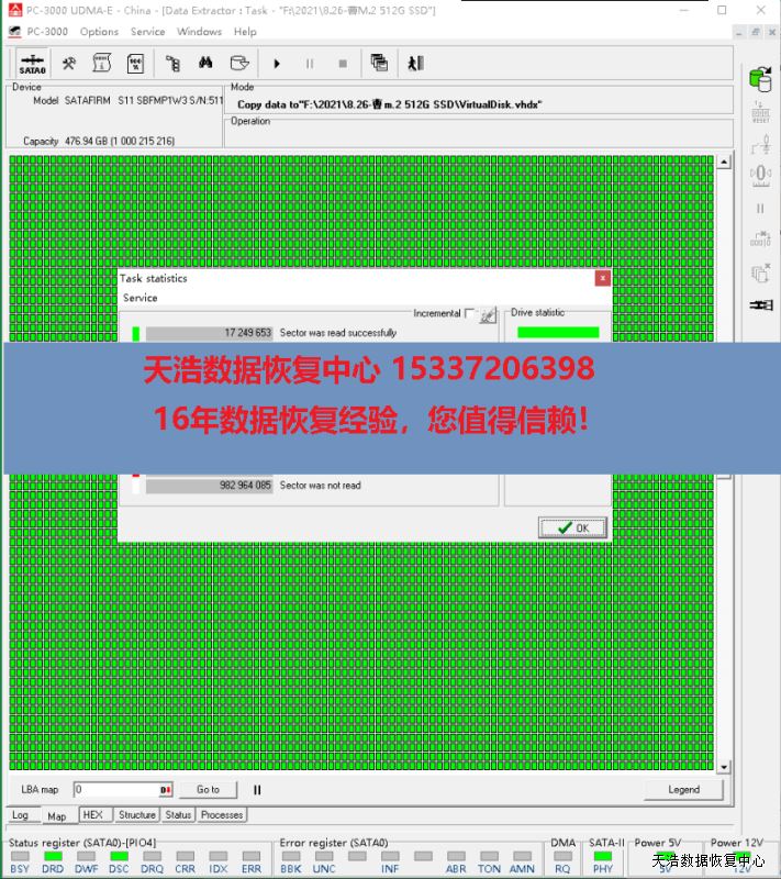 解决方案:收到硬盘后,检测硬盘正常认盘,但型号变成SATAFIRMS11,容量显示正常,但用工具检测发现全盘底层都是00。我们使用专业的SSD恢复工具ACE PC3000 SSD,处理固件问题,虚拟重建编译器,用PC3000 DE虚拟镜像,成功恢复里面客户公司的几乎全部工作资料。