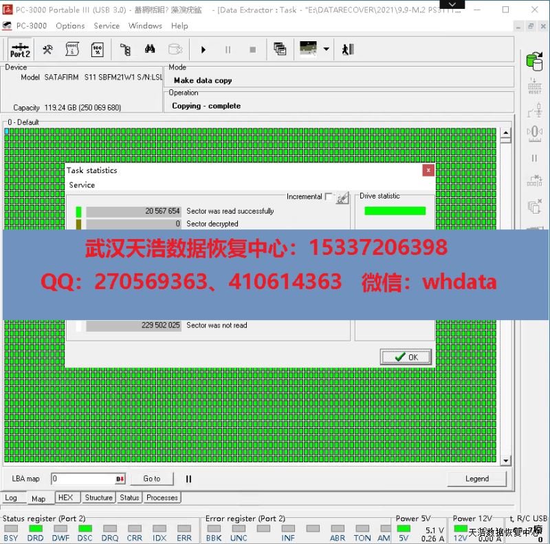 解决方案:收到硬盘后,检测硬盘正常认盘,但型号变成SATAFIRMS11,容量显示正常,但用工具检测发现全盘底层都是00。我们使用专业的SSD恢复工具ACE PC3000 SSD,处理固件问题,虚拟重建编译器,用PC3000 DE虚拟镜像,成功恢复客户硬盘内几乎全部数据。
