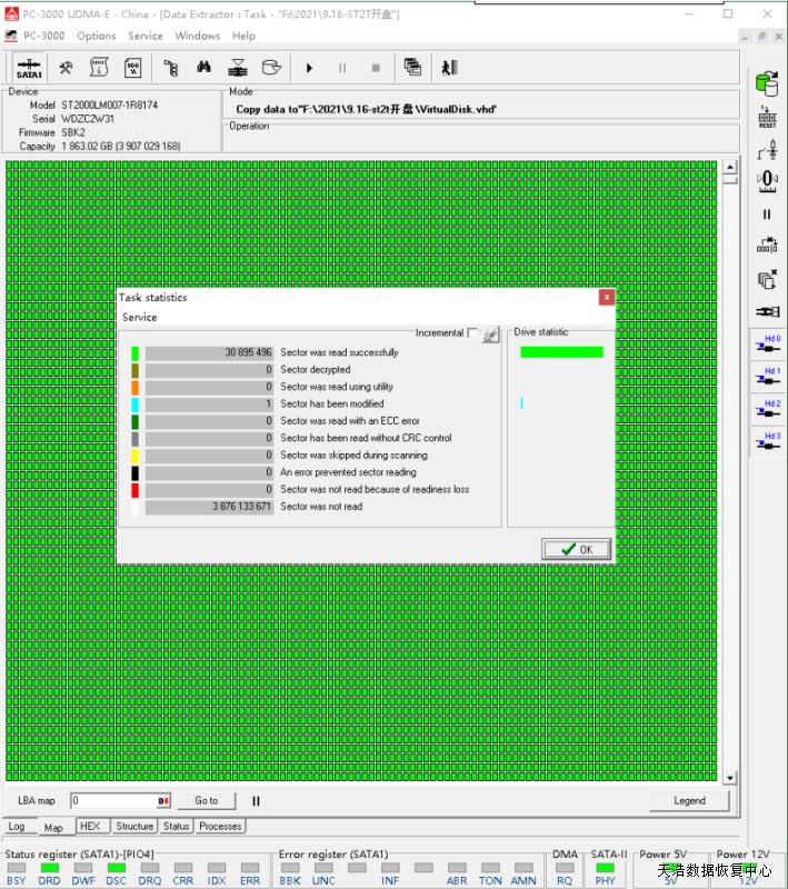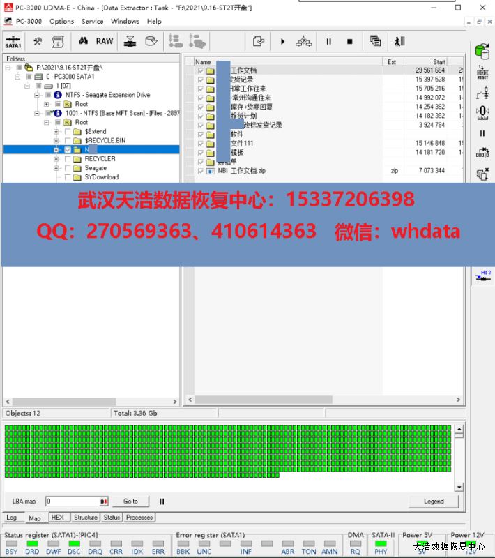 解决方案:收到硬盘后,我们在无尘环境打开盘体,清洗盘片,然后更换兼容的磁头,再接到数据恢复工具PC-3000 UDMA Express上,通电,硬盘正常认盘,镜像,成功恢复客户硬盘几乎全部数据!