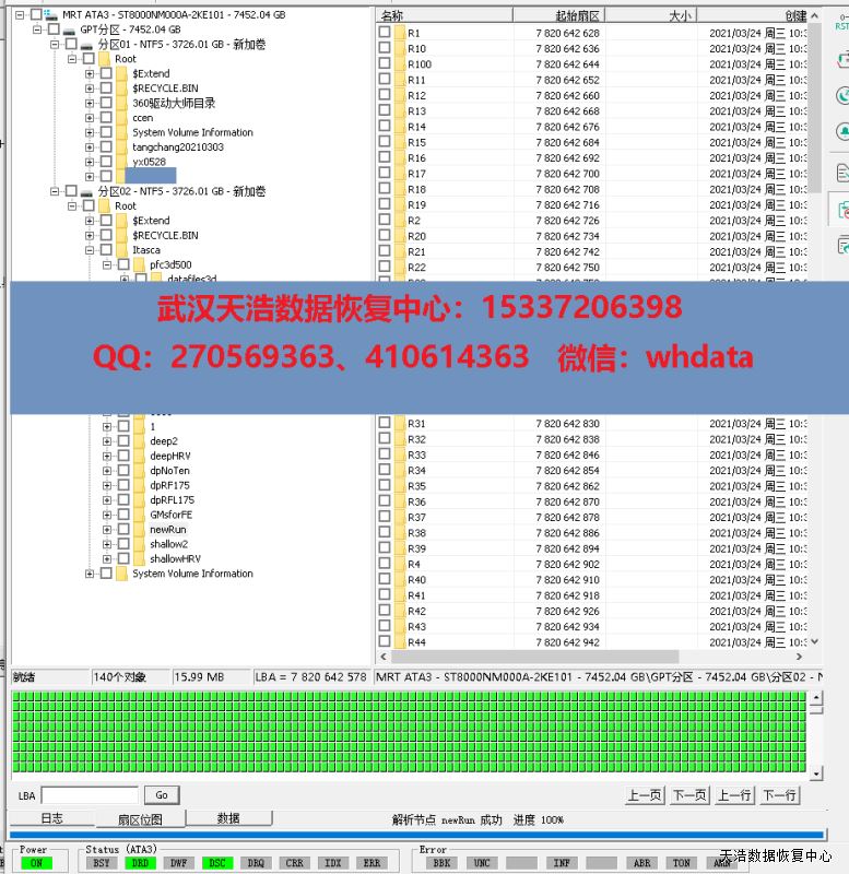 解决方案:收到硬盘后,接到数据恢复设备上通电,硬盘正常认盘,但数据区不能正常访问,全盘坏道!这是这种硬盘常见的固件问题,解锁处理固件问题后,数据区均能正常访问,镜像,成功恢复客户硬盘内几乎全部数据!