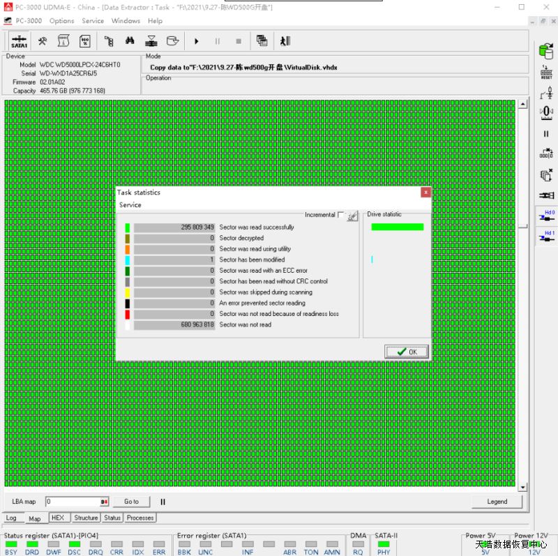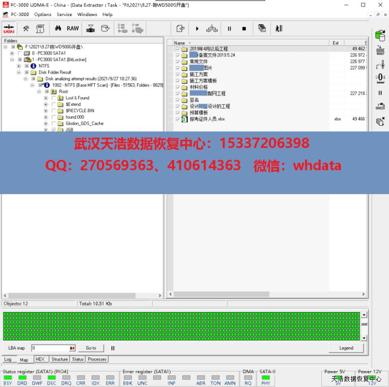 解决方案:收到硬盘后,接到专业数据恢复工具PC3000 UDMA Express上,检测发现有一个磁头不良 ,在无尘环境更换兼容的磁头,再接到PC3000 UDMA Express上,DE镜像,成功恢复硬盘内客户几乎全部数据!