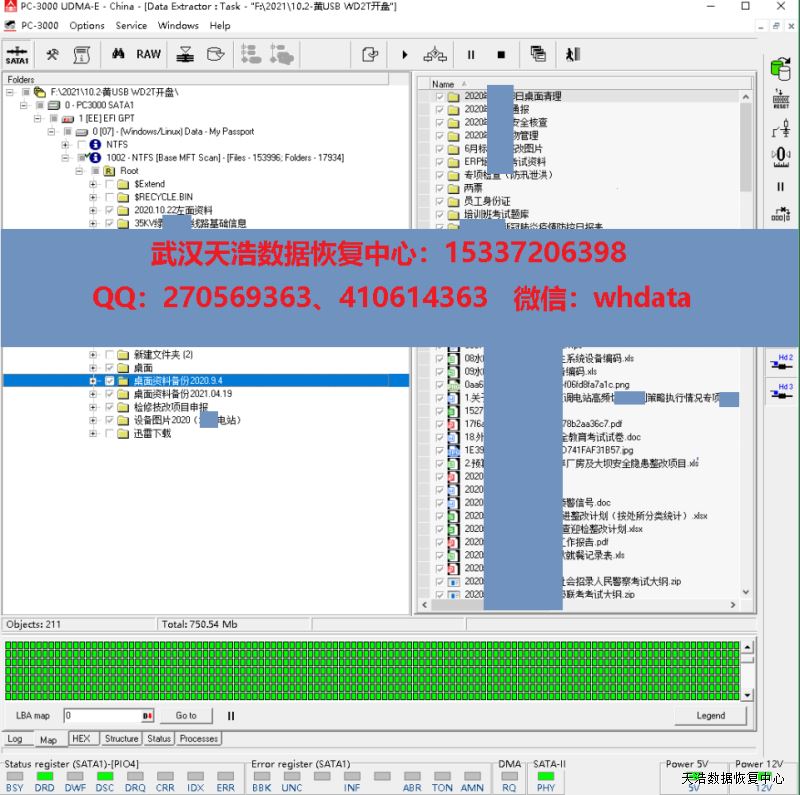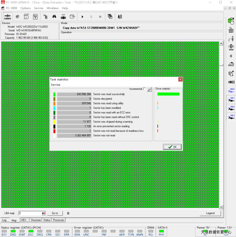 解决方案:收到硬盘后,我们在无尘环境更换兼容的磁头,再更换兼容的SATA解锁电路板,接到专业数据恢复工具PC3000 UDMA EXPRESS上,通电硬盘正常认盘,DE分头,镜像,成功恢复客户硬盘内大部分数据!