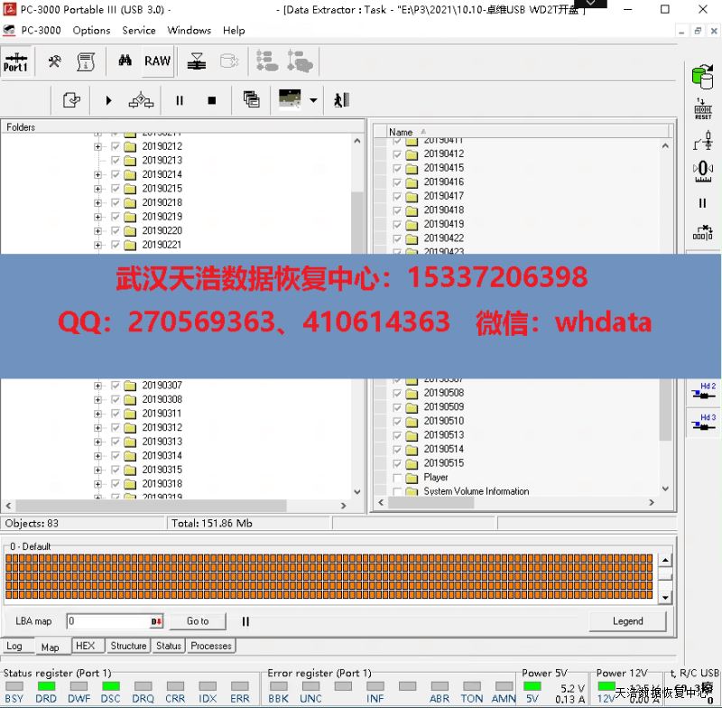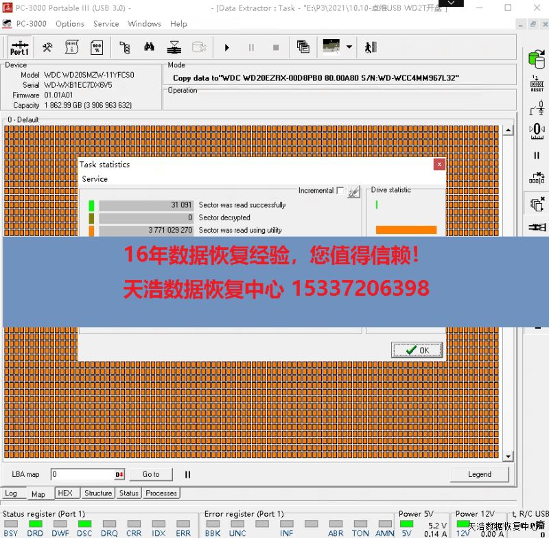 解决方案:收到硬盘后,我们在无尘环境更换兼容的磁头,再更换兼容的SATA解锁电路板,接到专业数据恢复工具PC3000 UDMA EXPRESS上,通电硬盘正常不认盘,检测修复固件,硬盘正常认盘,由于190模块有问题,导致只能工厂方式DE镜像,经过几天几夜镜像,数据基本完整恢复!