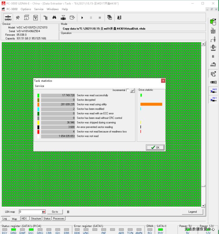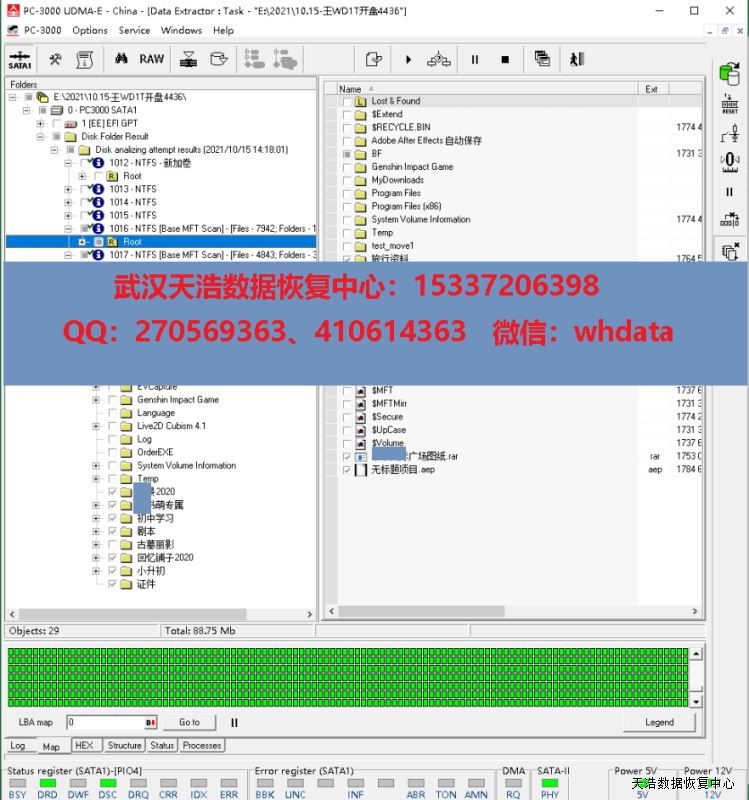 解决方案:收到硬盘后,我们在无尘环境更换兼容的磁头,再更换兼容的SATA解锁板,接到专业数据恢复工具PC3000 UDMA EXPRESS上,通电硬盘正常认盘,DE镜像,成功恢复客户硬盘内大部分数据!