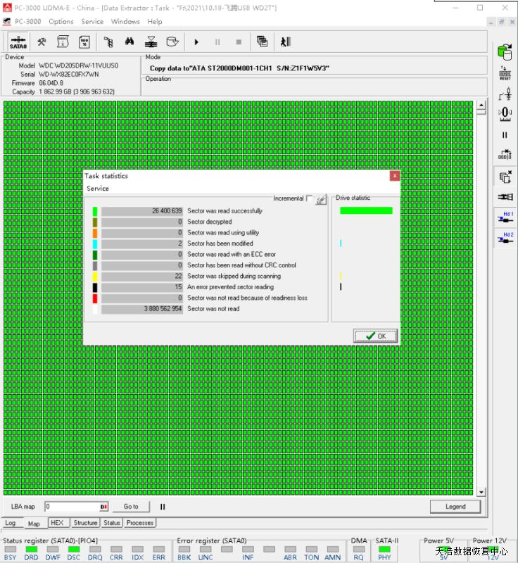 解决方案:收到硬盘后,我们在无尘环境更换兼容的磁头,再更换兼容的SATA解锁电路板,接到专业数据恢复工具PC3000 UDMA EXPRESS上,通电硬盘正常不认盘,检测修复固件,硬盘正常认盘,原USB板改SATA后,DE镜像,最后数据基本完整恢复!