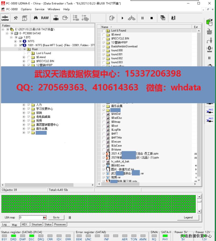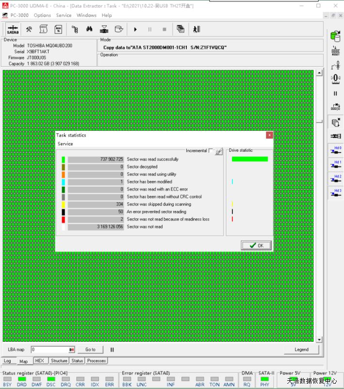 解决方案:收到硬盘后,我们在无尘环境更换兼容的磁头,再更换兼容的SATA电路板后,接到数据恢复工具PC3000 UDMA EXPRESS上,通电认盘,DE镜像,成功恢复客户硬盘里面的几乎全部数据。
