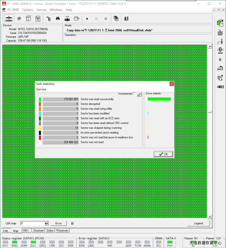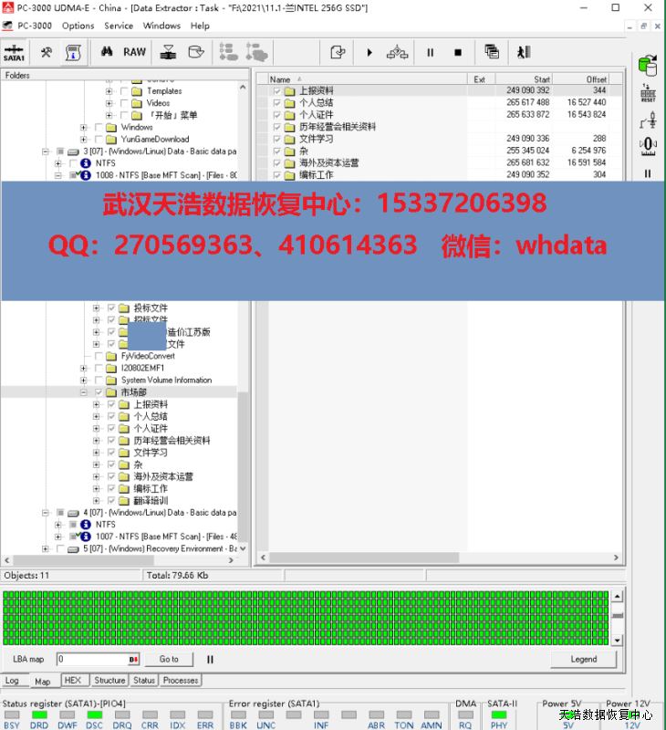解决方案:收到硬盘后,我们使用专业的SSD恢复工具ACE PC3000 SSD,短接通电,处理固件问题,虚拟重建编译器,用PC3000 DE虚拟镜像,成功恢复客户硬盘内几乎全部数据。