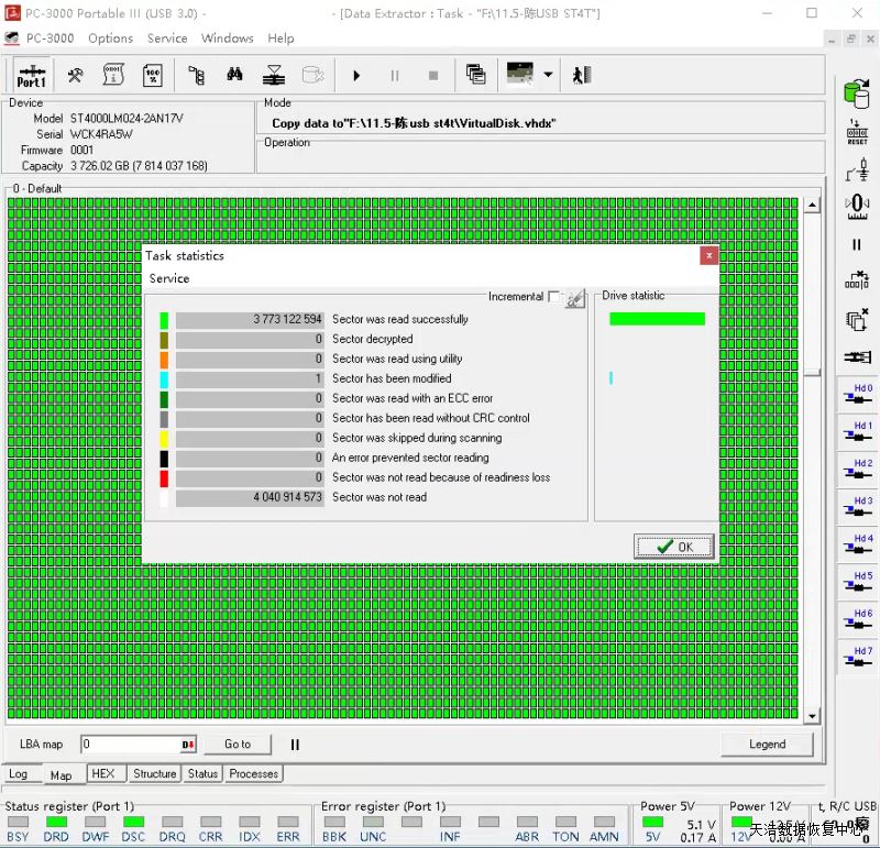 解决方案:收到硬盘后,接到数据恢复工具PC-3000 UDMA Express上通电不认盘,修复固件问题后,硬盘通电正常认盘,DE分头镜像,成功恢复客户硬盘内接近2T的数据。
