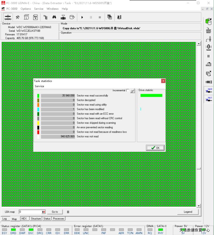解决方案:收到硬盘后,在无尘环境开盘更换兼容的磁头,再接到数据恢复工具PC-3000 UDMA Express上,通电正常认盘,DE分头镜像,成功恢复客户硬盘内的全部数据,包括客户公司的金碟帐套数据,也完美恢复。