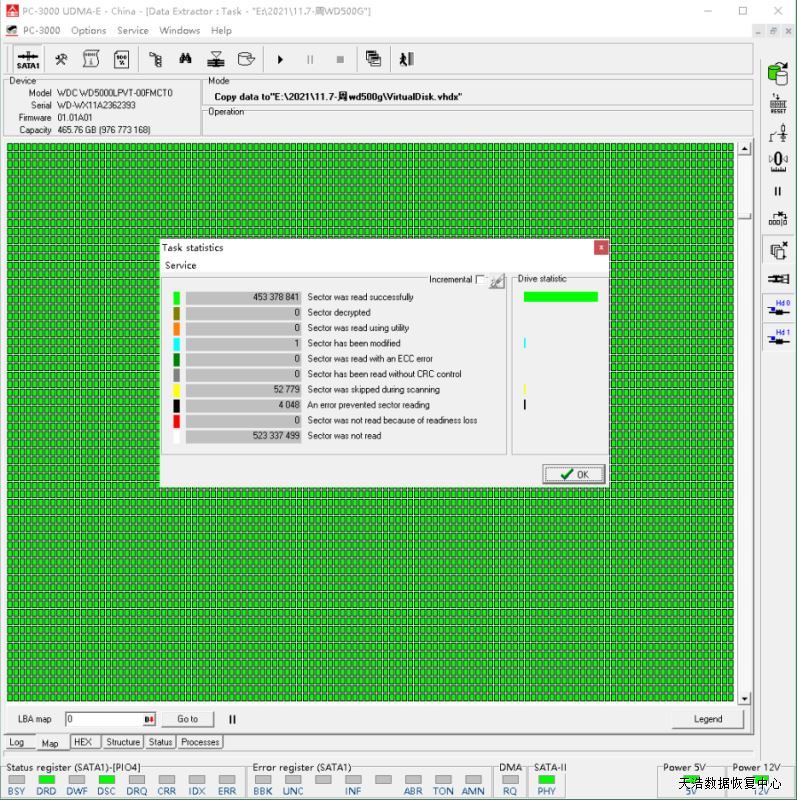 解决方案:收到硬盘后,接到数据恢复工具PC-3000 UDMA Express上,通电声音正常但反应非常慢,处理固件后,DE分头镜像,发现有一个磁头不良,在无尘环境开盘更换兼容的磁头,再DE镜像,成功恢复客户硬盘内的大部分重要数据。