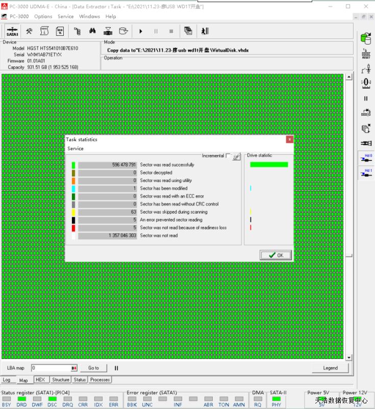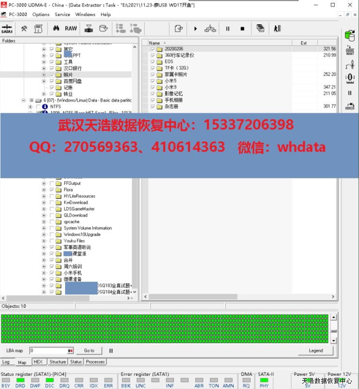 解决方案:收到硬盘后,更换兼容的SATA解锁电路板,接到专业数据恢复工具PC3000 UDMA EXPRESS上,通电硬盘认盘慢,修复固件问题,断电通电硬盘正常认盘,DE分头镜像,发现有一个磁头不良,在无尘环境更换兼容的磁头后,再DE镜像,最后成功恢复客户的几乎全部数据!