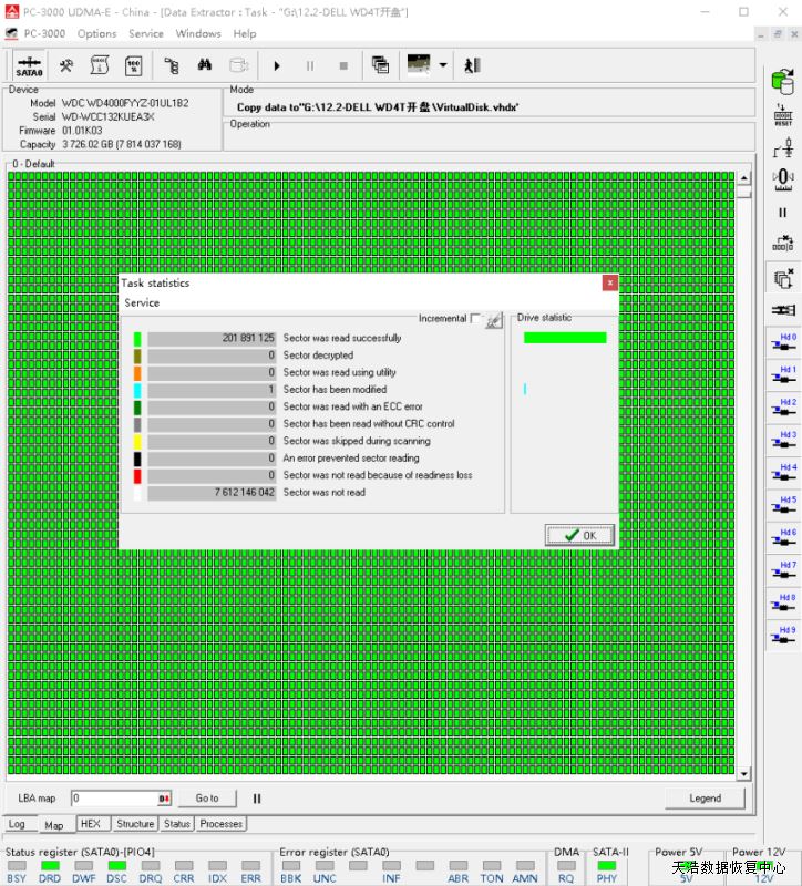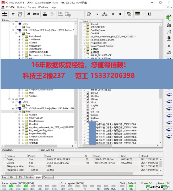 解决方案:收到硬盘后,接到数据恢复工具ACE PC3000 UDMA EXPRESS上,硬盘正常认盘,反应比较慢,处理固件问题后,DE分头测试,发现是有一个磁头不良,于是在无尘环境开盘更换兼容的磁头,再通电DE镜像,成功完美恢复客户硬盘内的重要数据,包括客户公司金碟帐套的数据!