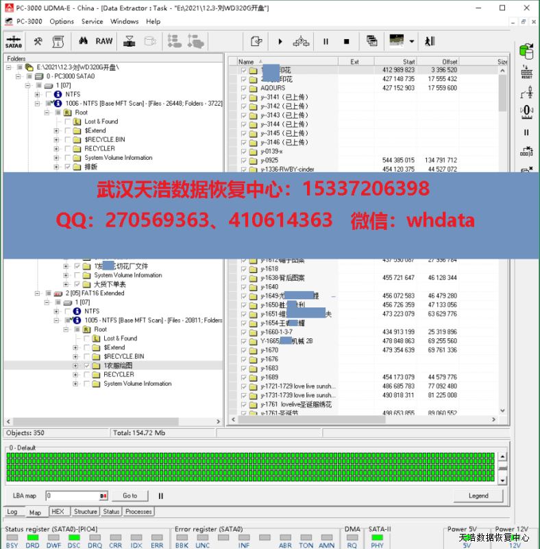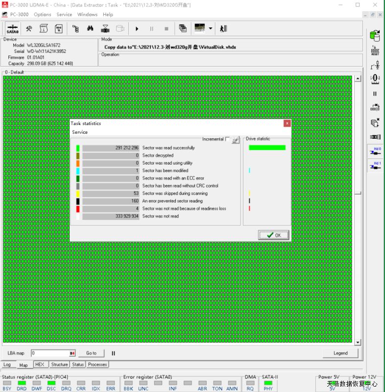 解决方案:收到硬盘后,接到数据恢复工具ACE PC3000 UDMA-EXPRESS上,通过电路板号和电路板上的ROM信息,确认硬盘家族和磁头信息后,在无尘环境开盘更换兼容的磁头,再通电硬盘正常认盘,DE镜像,成功完美恢复客户硬盘内的几乎全部重要数据。