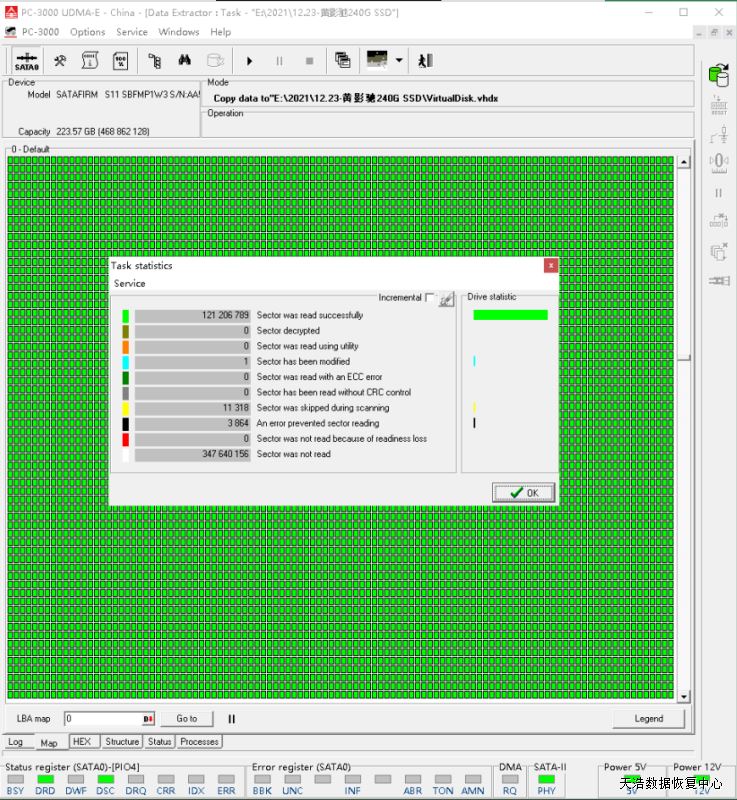 解决方案:收到硬盘后,我们使用专业的SSD恢复工具ACE PC3000 SSD,处理固件问题,虚拟重建编译器,用PC3000 DE虚拟镜像,成功恢复客户硬盘内几乎全部数据。