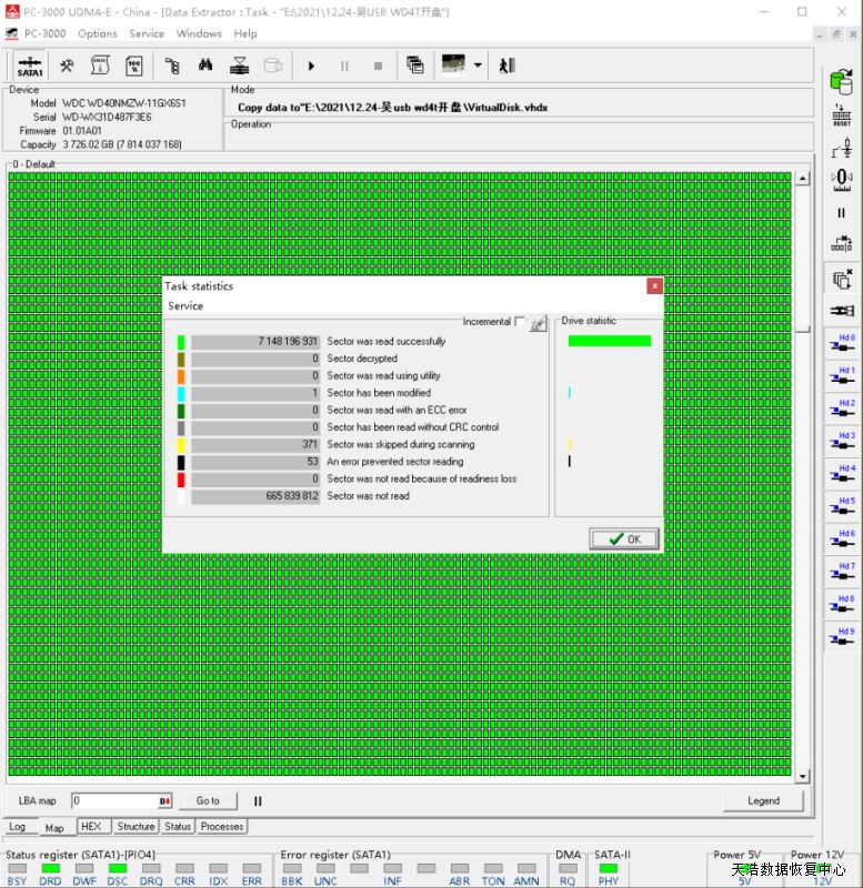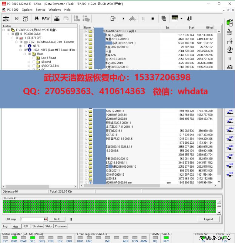 解决方案:收到硬盘后,我们在无尘环境更换兼容的磁头,再更换兼容的SATA解锁电路板,接到专业数据恢复工具PC3000 UDMA EXPRESS上,通电硬盘声音正常认盘,DE分头镜像,最后成功恢复客户的几乎全部数据!