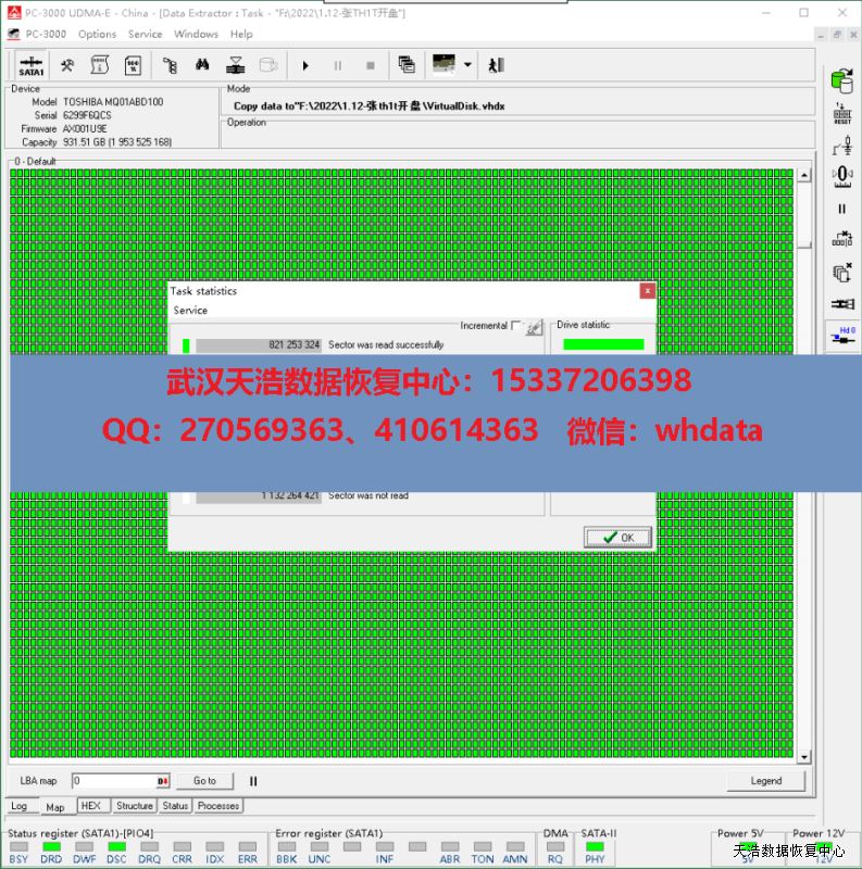 解决方案:收到硬盘后,我们在无尘环境更换兼容的磁头,接到数据恢复工具PC3000 UDMA EXPRESS上,通电认盘,DE镜像,成功恢复客户硬盘里面的几乎全部数据。