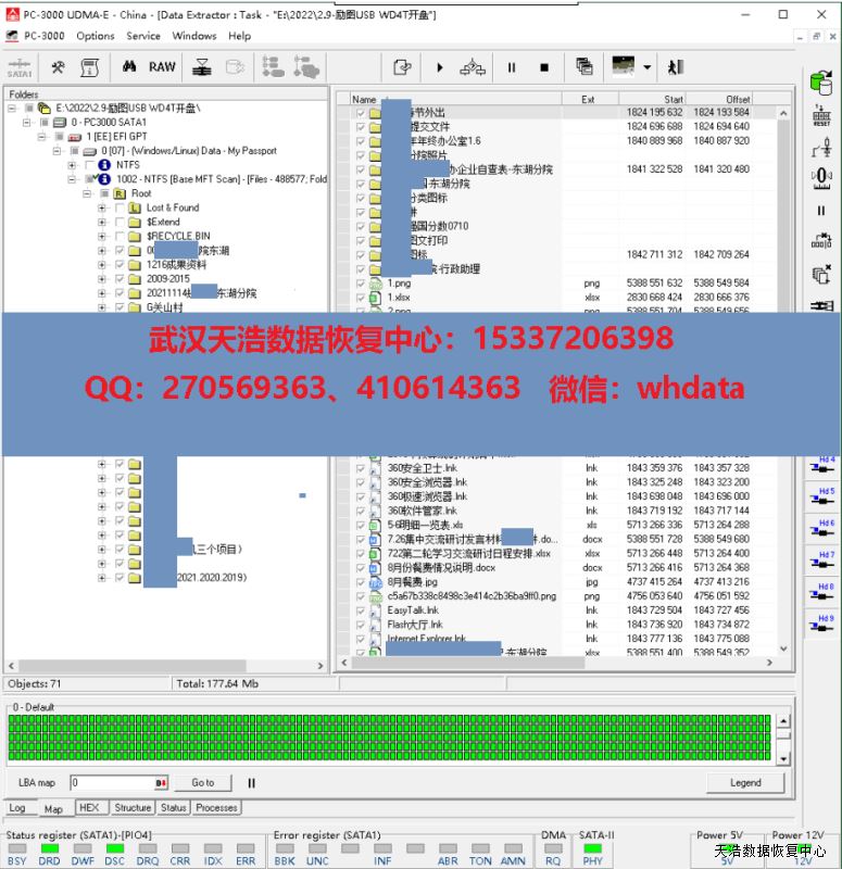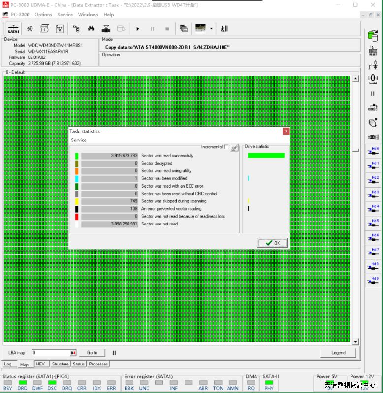 解决方案:收到硬盘后,我们在无尘环境更换兼容的磁头,再更换兼容的SATA解锁电路板,接到专业数据恢复工具ACE PC-3000 UDMA Express上,通电硬盘声音正常不认盘,处理固件问题后,硬盘正常认盘,DE分头,再原始usb板改SATA镜像,最后成功恢复客户2T的重要数据!