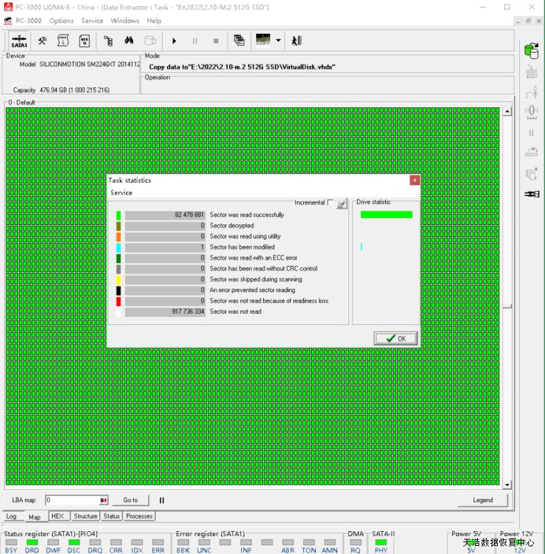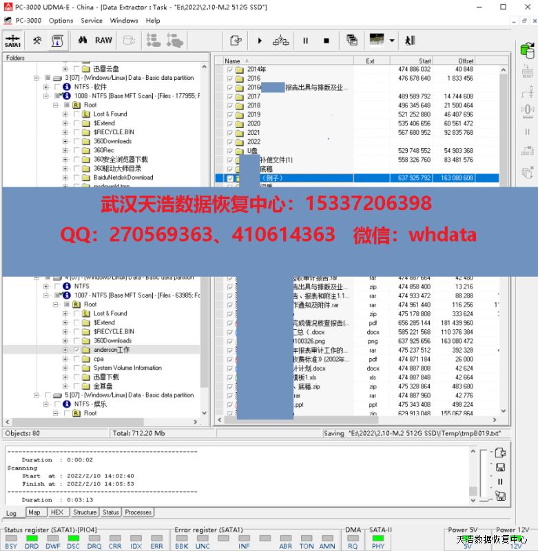 解决方案:收到硬盘后,我们使用专业的SSD恢复工具ACE PC3000 SSD,处理固件问题,虚拟重建编译器,用PC3000 DE虚拟镜像,成功恢复客户硬盘内40G的重要数据。