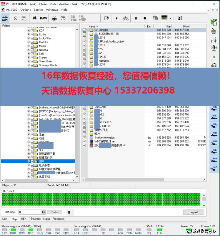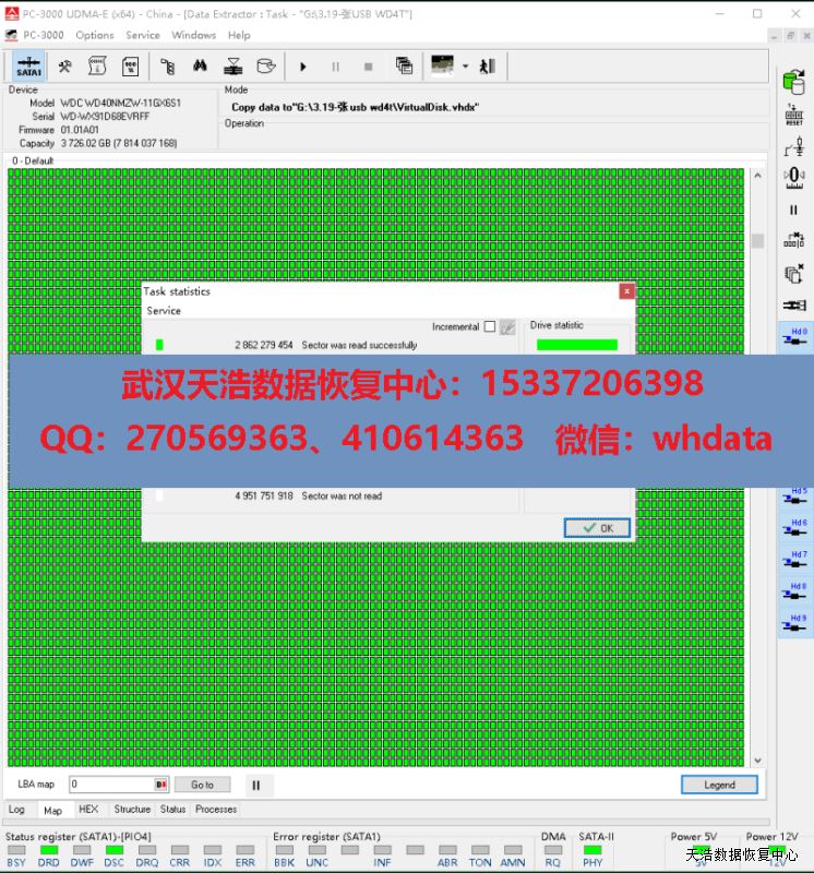 解决方案:收到硬盘后,我们更换兼容的SATA解锁电路板,接到专业数据恢复工具ACE PC-3000 UDMA Express上,通电硬盘声音正常认盘,固件问题常规处理,DE分头镜像,发现有2个磁头不良,在无尘环境更换兼容的全好磁头,再镜像,最后成功恢复客户硬盘内几乎全部重要数据!