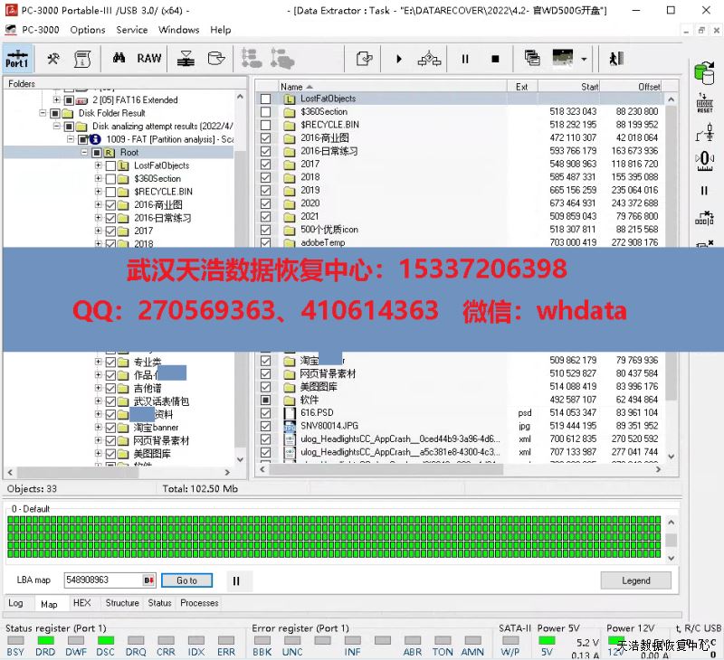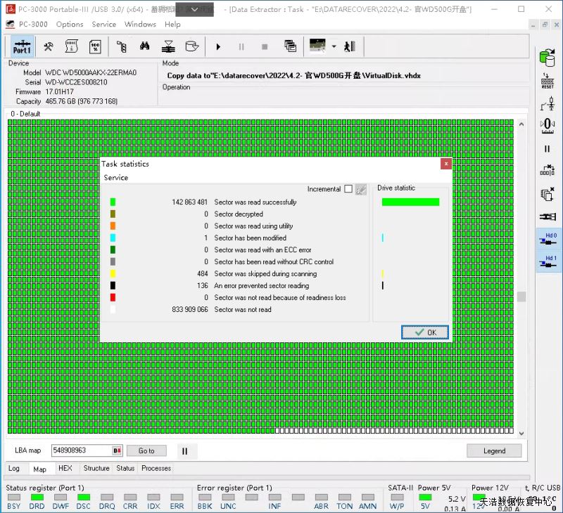 解决方案:收到硬盘后,在无尘环境开盘,发现磁头变形,2个黑片片都被打飞了,盘片有轻微划伤,清洗盘片后,更换兼容的磁头,再接到数据恢复工具PC-3000 UDMA Express上,通电硬盘正常认盘,DE镜像,成功恢复客户硬盘内绝大部分数据。