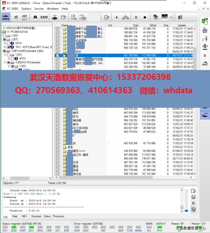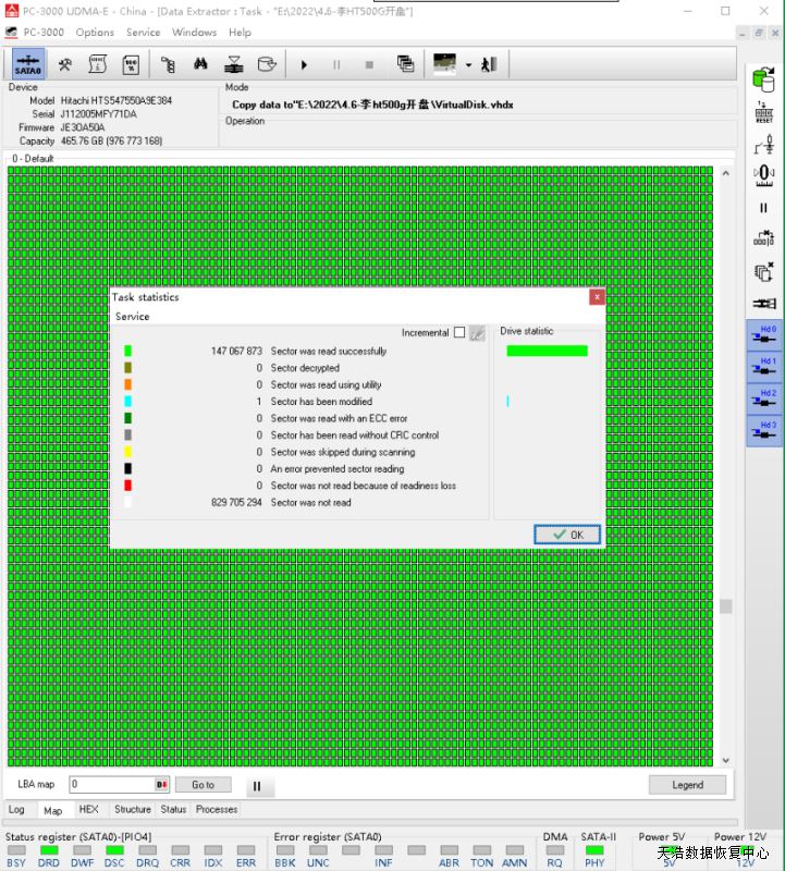 解决方案:收到硬盘后,我们从备件库找到匹配的备件,在无尘柜里面更换磁头,再接到数据恢复工具PC-3000 UDMA Express上,通电硬盘认盘,数据区前后都能正常访问,DE镜像,成功恢复客户单位需要的全部数据!