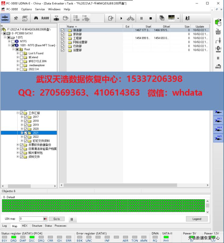 解决方案:收到硬盘后,我们在无尘环境拆开硬盘,发现盘片有一面有划伤,清洗盘片后,更换兼容的磁头,接到数据恢复工具PC3000 UDMA EXPRESS上,通电认盘,DE镜像,成功恢复客户硬盘里面的大部分重要数据。