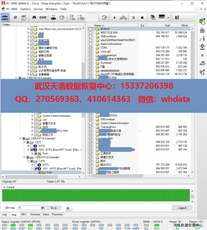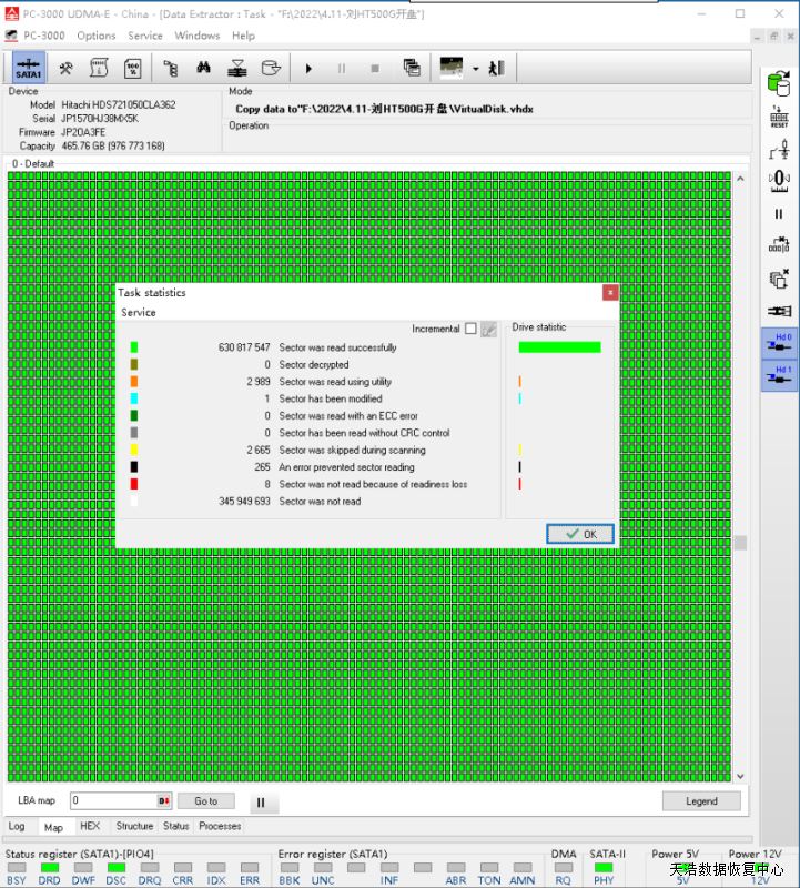 解决方案:收到硬盘后,我们接到数据恢复工具PC-3000 UDMA Express上,通电检测认盘,DE分头测试,发现是有一个磁头损坏 ,从备件库找到匹配的备件,在无尘柜里面更换磁头,再接到数据恢复工具PC-3000 UDMA Express上,硬盘认盘,数据区前后都能正常访问,DE镜像,成功恢复客户单位需要的几乎全部数据!